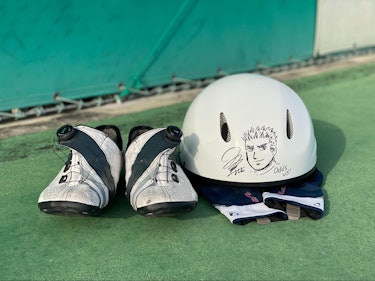 靴下もレーサーシューズ、シューズカバーぜんぶ左足から履きます。「くみにい」です。