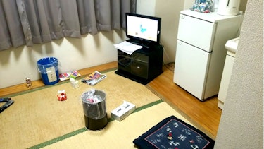 写真の様に、畳の部屋には基本的にテレビと冷蔵庫、机と座布団が置いてあります。