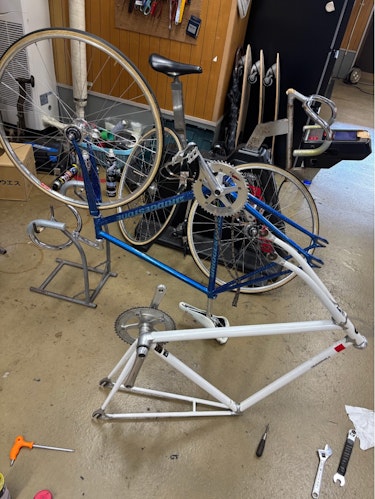 練習用フレームから部品を取り外して、奥のブルーのフレームに取り付けている最中というわけですね。