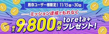 【11/15〜11/30】既存ユーザー様限定!ミッションクリアで最大9,800円分のtoreta+ をもれなくプレゼント