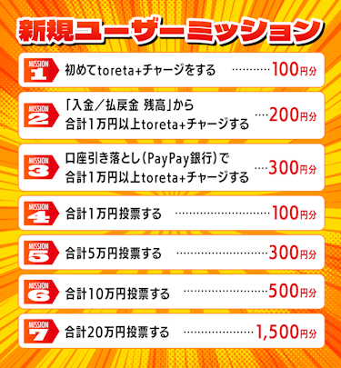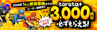 新規登録&簡単なミッション達成で投票に使えるtoreta+ を最大3,000円分プレゼント!