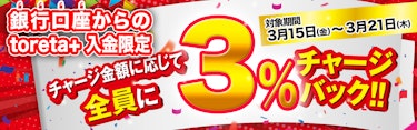 3/15(金)〜3/21(木)の期間中に行った「銀行振込」でのチャージ総額に応じてtoreta+ にチャージバックいたします。