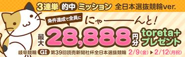 【2/9-2/12】岐阜競輪 GI にゃーんと!最大toreta+ 28,888円分が必ずもらえる「3連単的中ミッション」実施