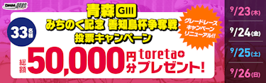 9/23(木)~9/26(日)の間、青森競輪 GⅢ「みちのく記念 善知鳥杯争奪戦」に3,000円以上ご投票された方の中から抽選で33名様に、総額50,000円分の toreta+ をプレゼント!