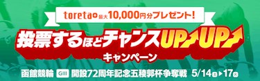 5/14(土)〜5/17(火)の間、函館競輪 GⅢ「開設72周年記念五稜郭杯争奪戦」に1,000円以上ご投票された方の中から、抽選で33名様に最大10,000円分のtoreta+ をプレゼント!