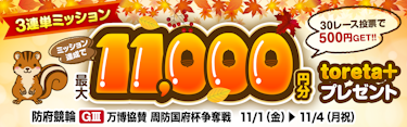 【11/1-11/4】防府競輪GⅢ 3連単ミッション 条件達成で全員に最大11,000円分のtoreta+ プレゼント