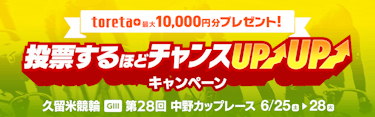 6/25(土)〜6/28(火)の間、久留米競輪 GⅢ「第28回 中野カップレース」に1,000円以上ご投票された方の中から、抽選で33名様に最大10,000円分のtoreta+ をプレゼント!