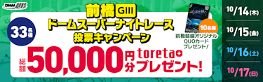 10/14(木)~10/17(日)の間、前橋競輪 GⅢ「ドームスーパーナイトレース」に3,000円以上ご投票された方の中から抽選で33名様に、総額50,000円分の toreta+ をプレゼント!