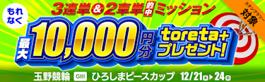 【12/21-12/24】玉野競輪 GⅢ 3連単&2車単的中ミッション! 条件達成でもれなく最大10,000円分のtoreta+ プレゼント