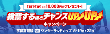 5/19(木)〜5/22(日)の間、宇都宮競輪 GⅢ「ワンダーランドカップ」に1,000円以上ご投票された方の中から、抽選で33名様に最大10,000円分のtoreta+ をプレゼント!