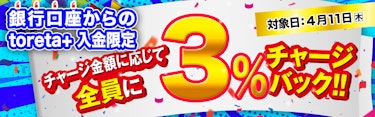 4/11(木)限定で「銀行振込」からの1回の toreta+ チャージ最大額に応じた額の3%をチャージバックします。