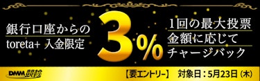 5/23(木)限定で「銀行振込」からの1回の toreta+ チャージ最大額に応じた額の3%をチャージバックします。