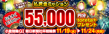 最大55,000円分のtoreta+ をゲット!小倉競輪G1 払戻金ミッションを見逃すな