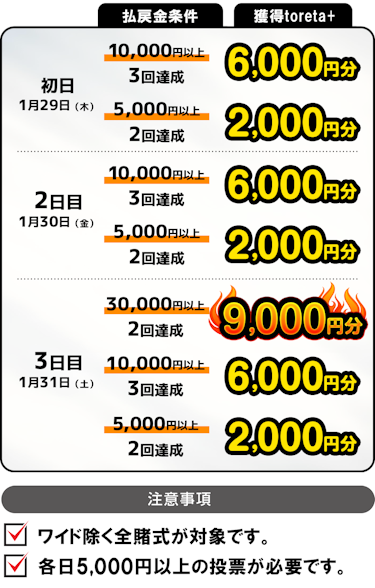 - 対象レースが中止・順延となった場合、キャンペーン対象日も順延となります。