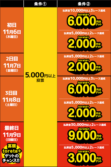 - 対象レースが中止・順延となった場合、キャンペーン対象日も順延となります。