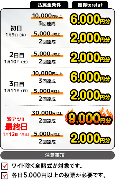- レース中止・打切の場合、キャンペーンは開催日により調整となります。