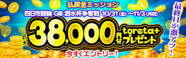 四日市競輪G3 払戻金ミッション 最大toreta+ 38,000円分プレゼント