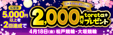【4/18(金)限定】松戸競輪・大垣競輪 ミッドナイト 払戻金ミッション! 条件達成でもれなくtoreta+ 2,000円分プレゼント
