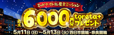【5/11-5/13】四日市競輪・奈良競輪 ミッドナイト 払戻金ミッション! 条件達成で最大toreta+ 6,000円分プレゼント