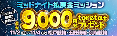 ミッドナイトで払戻金ミッション!条件達成で9,000円分のtoreta+ をゲット