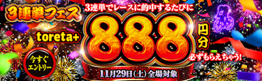 【3連単フェスで的中量産】11/29は3連単を的中するごとに toreta+ 888円分ゲット!