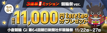 【11/22〜11/27】小倉競輪 GI 最大toreta+ 11,000円分が必ずもらえる「3連単的中ミッション」実施