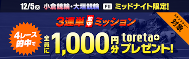 【12/5限定】小倉競輪・大垣競輪ミッドナイト 3連単的中ミッション! 条件達成でもれなくtoreta+ プレゼント