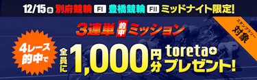 【12/15限定】別府競輪・豊橋競輪ミッドナイト 3連単的中ミッション! 条件達成でもれなくtoreta+ プレゼント