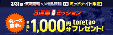 【3/31限定】伊東競輪・小松島競輪ミッドナイト 3連単的中ミッション! 条件達成でもれなくtoreta+ プレゼント