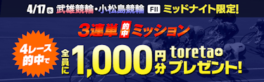 【4/17限定】武雄競輪・小松島競輪ミッドナイト 3連単的中ミッション! 条件達成でもれなくtoreta+ プレゼント