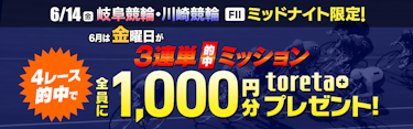 岐阜競輪・川崎競輪ミッドナイト競輪を対象として、3連単で全18レース中4レース以上的中した方へもれなくtoreta+ 1,000円分プレゼントいたします!