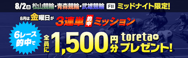 【8/2限定】松山競輪・青森競輪・武雄競輪ミッドナイト 3連単的中ミッション! 条件達成でもれなくtoreta+ プレゼント