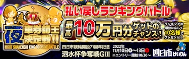 11/10(木)~11/13(日)の間、四日市競輪 GⅢ「泗水杯争奪戦」に5,000円以上投票し、払戻合計額ランキング TOP10に入られた方に最大100,000円の現金をプレゼント!