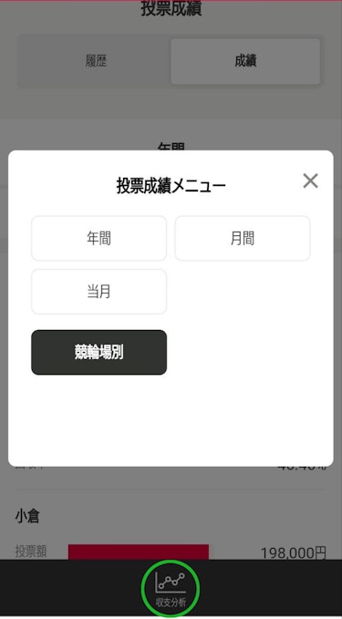 「投票履歴」→「成績」をタップ後、画面一番下の「収支分析」をタップして投票成績メニューを表示させます。