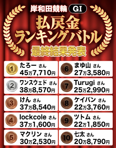 岸和田競輪GI 払戻金ランキングの最終結果発表を行います。