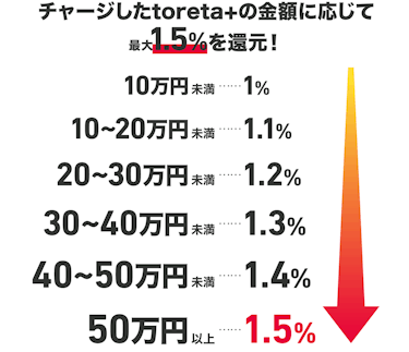 ご利用額に応じて、最大1.5%のtoreta+ を受け取ることができます!