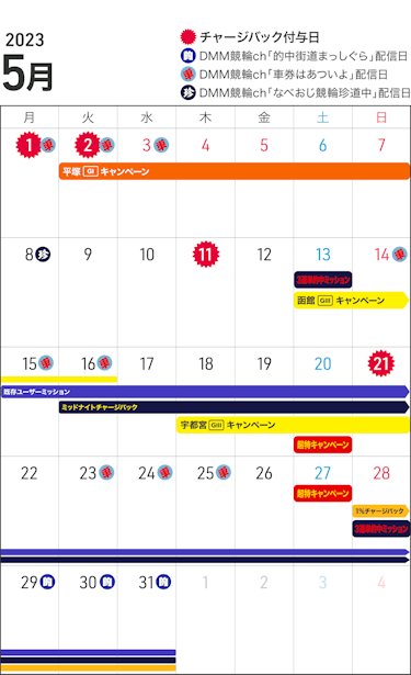 2023年5月にDMM競輪で実施するキャンペーンやチャージバック、番組のスケジュールをお届けします。